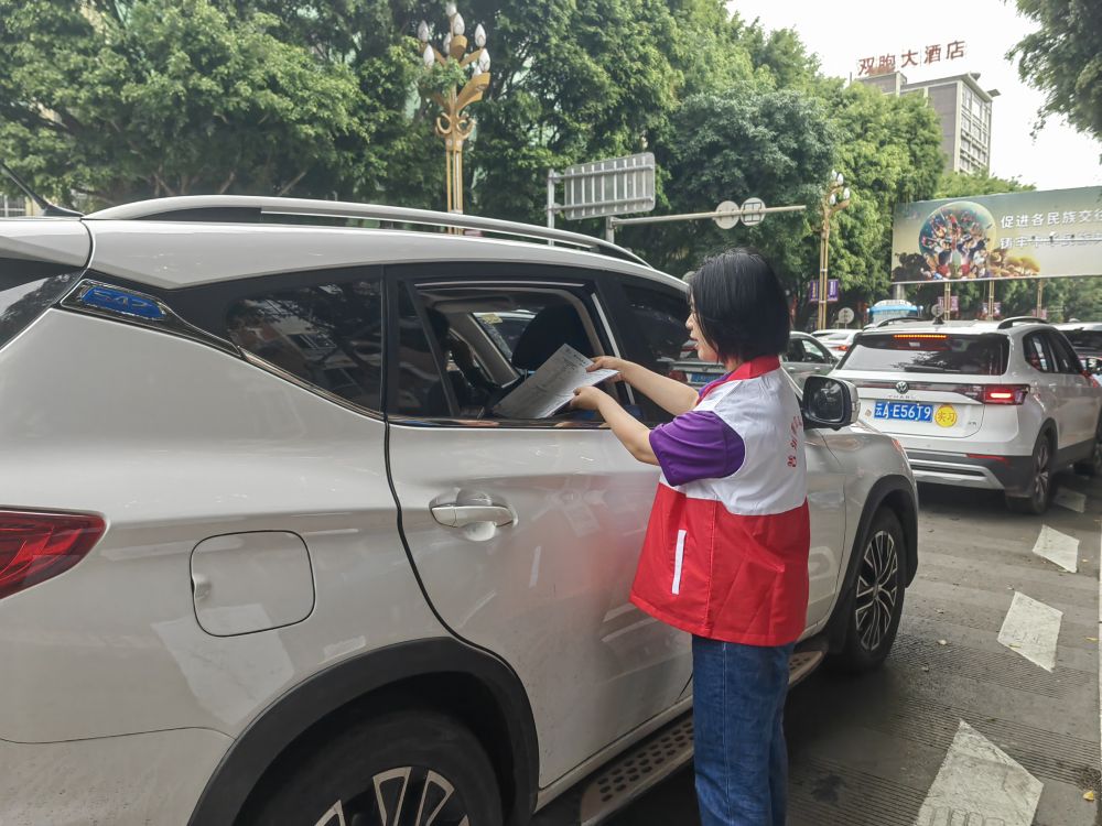 5月2日,云南省墨江哈尼族自治縣一名志愿者向游客發(fā)放節(jié)慶活動行程單。(墨江縣融媒體中心供圖)
