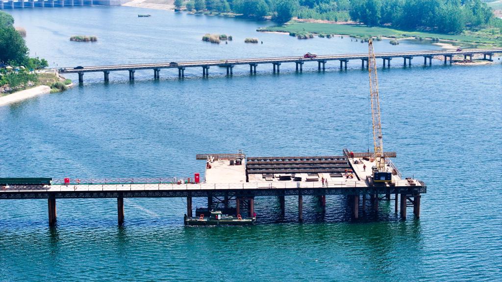 國家重點(diǎn)項目濰(坊)宿(遷)高速鐵路項目承建方正搶抓工期與節(jié)點(diǎn),穩(wěn)步推進(jìn)標(biāo)段施工。4月30日,在濰宿高鐵山東郯城段,中鐵上海局的工作人員在進(jìn)行沭河特大橋施工(無人機(jī)照片)。新華社記者 郭緒雷 攝