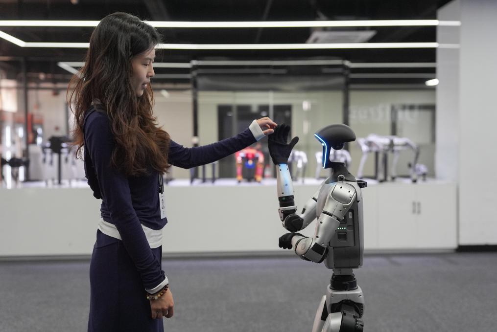 4月23日,在知名機(jī)器人公司杭州宇樹科技展廳內(nèi),宇樹人形機(jī)器人G1展示模仿動漫角色奧特曼的“光波”動作。 新華社記者 黃宗治 攝