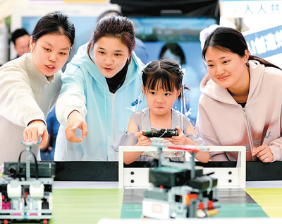4月28日,在福建省福州市鼓樓區(qū)鼓東街道冶山春秋園,小朋友正在體驗(yàn)足球機(jī)器人。謝貴明攝(人民視覺)