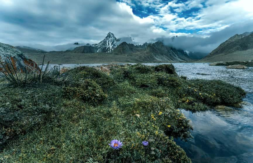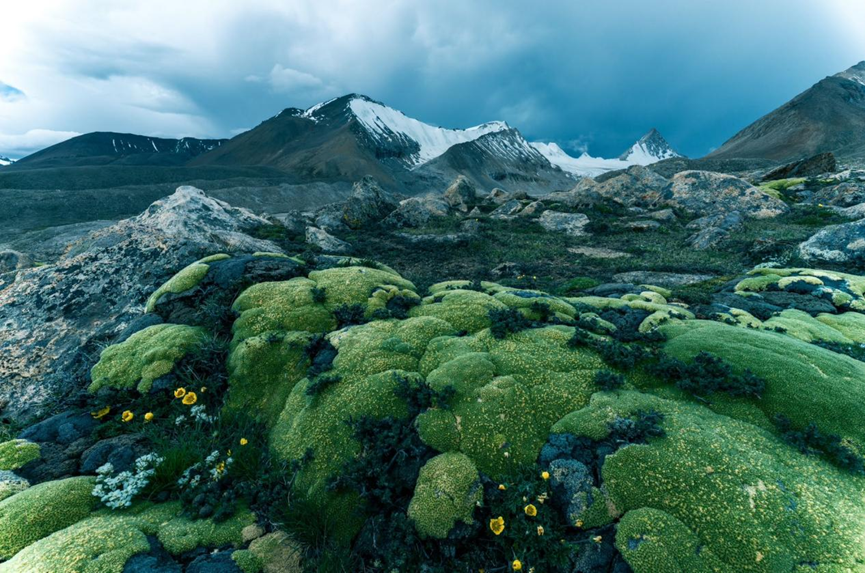 第二天一早,我們繼續(xù)向山脈的腹地去探索,前往冷布崗日腹地的道路也是無人踏足的,沒有正規(guī)車道的,所以我們同樣只能沿著牧民留下的車轍印前行。在一望無際的高原上,我們找不到路的時(shí)候就操縱無人機(jī)升空去探索路線。經(jīng)過了一整天的艱難探索,終于抵達(dá)了目的地,這個(gè)地方再往上走是完全沒有路了。在海拔約5800米左右的這個(gè)地方,不僅有巍峨壯美的雪山,還長著很多這種獨(dú)特的高山苔蘚,這種植被通常只分布在海拔4000米以上的地區(qū),極具地域特色。所以在拍攝時(shí),我將這些高原特有的植被作為前景,既展現(xiàn)了高原生態(tài)風(fēng)貌,也作為海拔高度的天然標(biāo)識(shí),然后遠(yuǎn)處雄偉的冷布崗日雪山則構(gòu)成了畫面的核心部分。