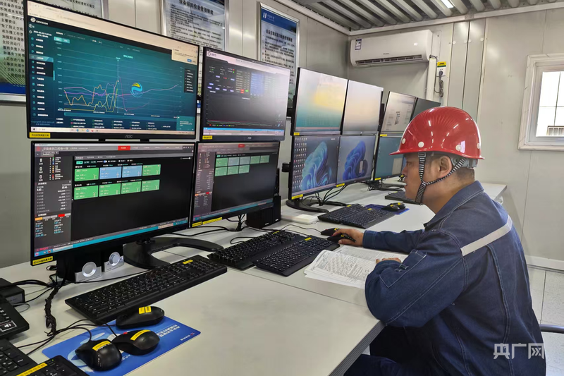 華能塔城地區(qū)托里縣50萬(wàn)千瓦風(fēng)電項(xiàng)目人員在查看后臺(tái) (央廣網(wǎng)發(fā) 馬曉杉 攝)