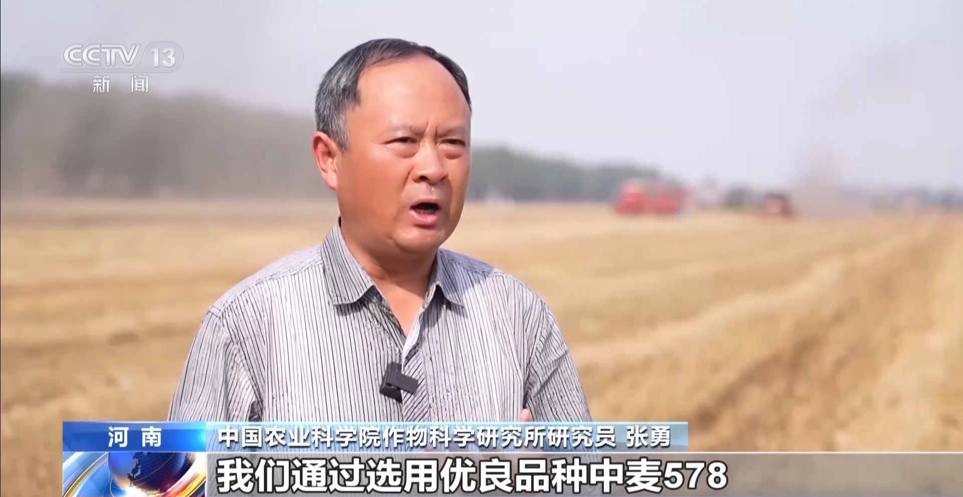中國農(nóng)業(yè)科學院作物科學研究所研究員 張勇:我們通過選用優(yōu)良品種中麥578,通過適期的晚播,播前播后鎮(zhèn)壓,一噴三防,每畝比咱們的周邊地塊要增產(chǎn)200斤。
