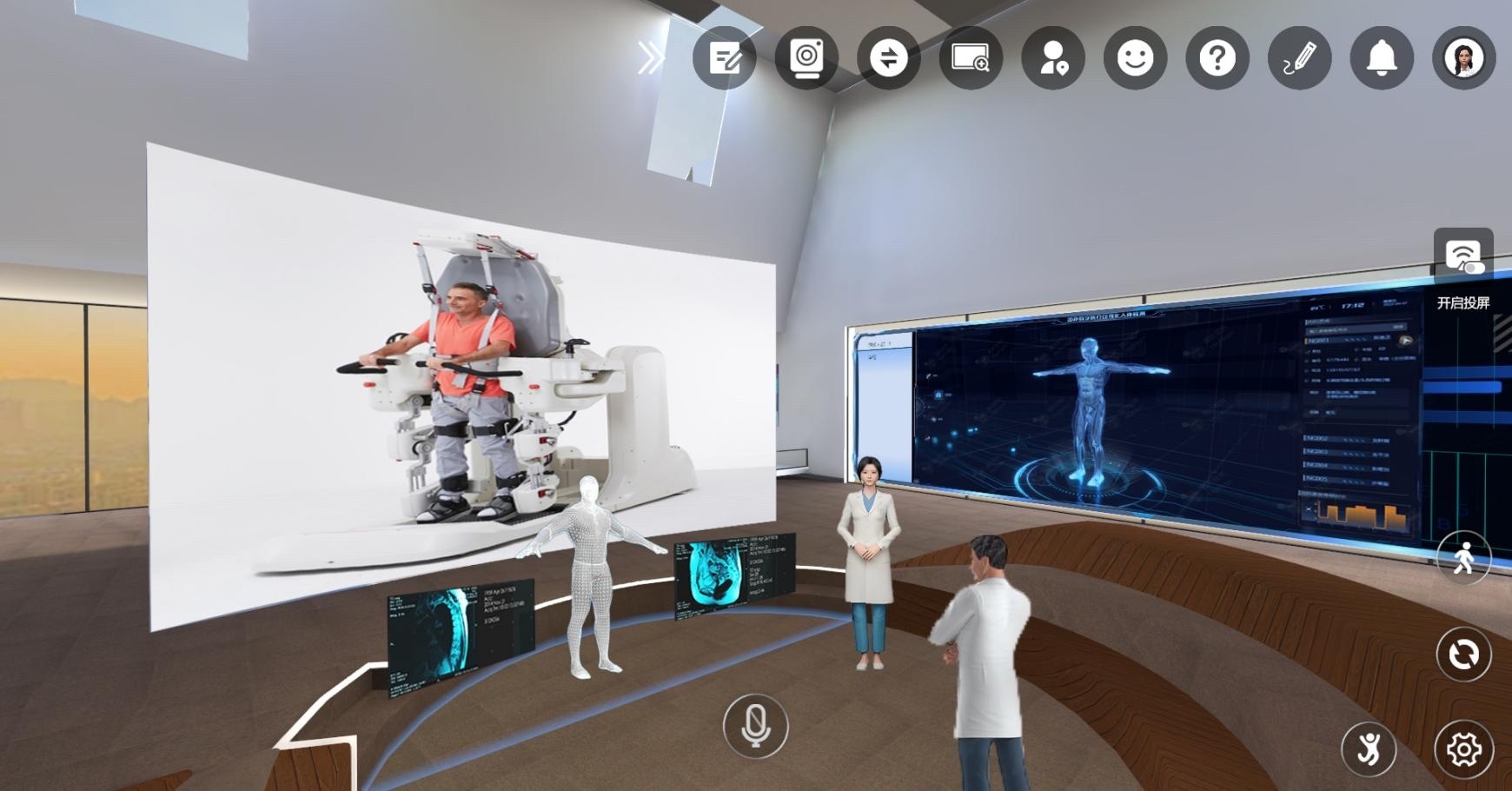 “就像推開一扇通往平行世界的門,這種‘在場感’是傳統(tǒng)遠程協(xié)作難以企及的。”維賽客首席運營官徐晨翔邊演示邊解釋道。他調(diào)出了VS·work中的“智聯(lián)康復(fù)元診療平臺”——這是維賽客在醫(yī)療元宇宙領(lǐng)域的創(chuàng)新應(yīng)用,集成了病情診療、康復(fù)訓(xùn)練、社交培訓(xùn)等功能。在虛擬界面中,醫(yī)生可以通過高精度空間定位系統(tǒng)“走進”患者的虛擬診療室,患者則通過可穿戴設(shè)備完成肌力評估、平衡訓(xùn)練等動作,數(shù)據(jù)實時反饋至醫(yī)生終端,為偏遠地區(qū)的患者提供了更加便捷、高效的診療服務(wù)。