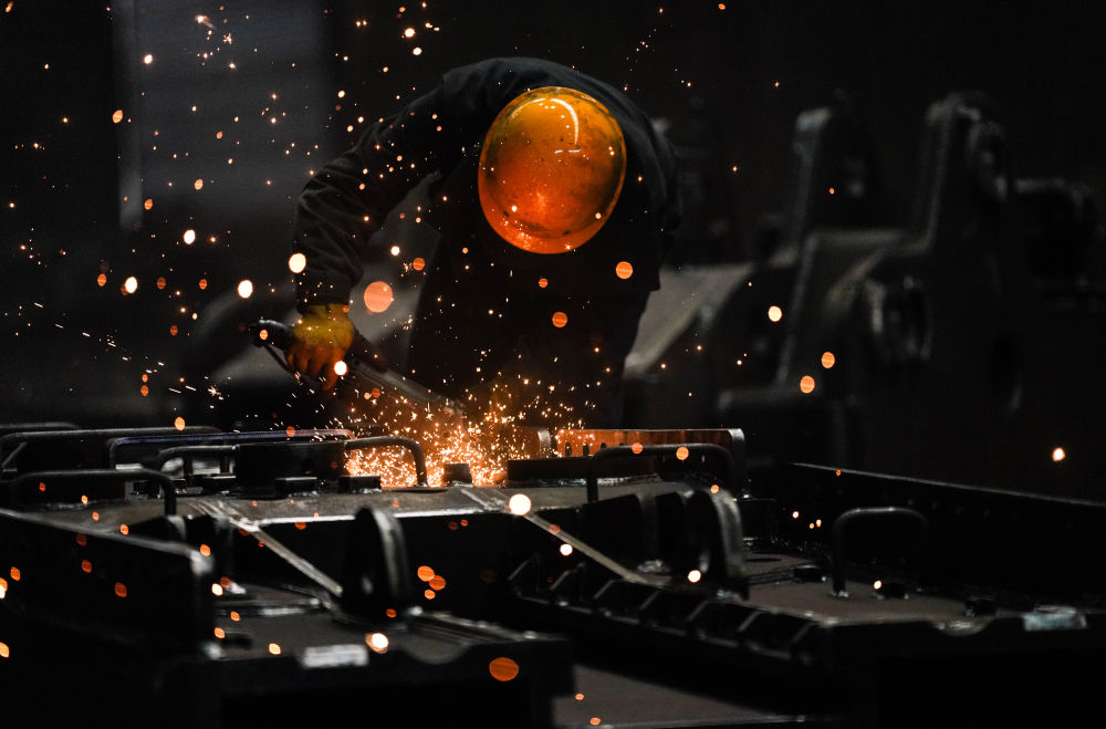 3月19日,工人在林州重機(jī)集團(tuán)股份有限公司的鉚焊車間進(jìn)行打磨作業(yè)。