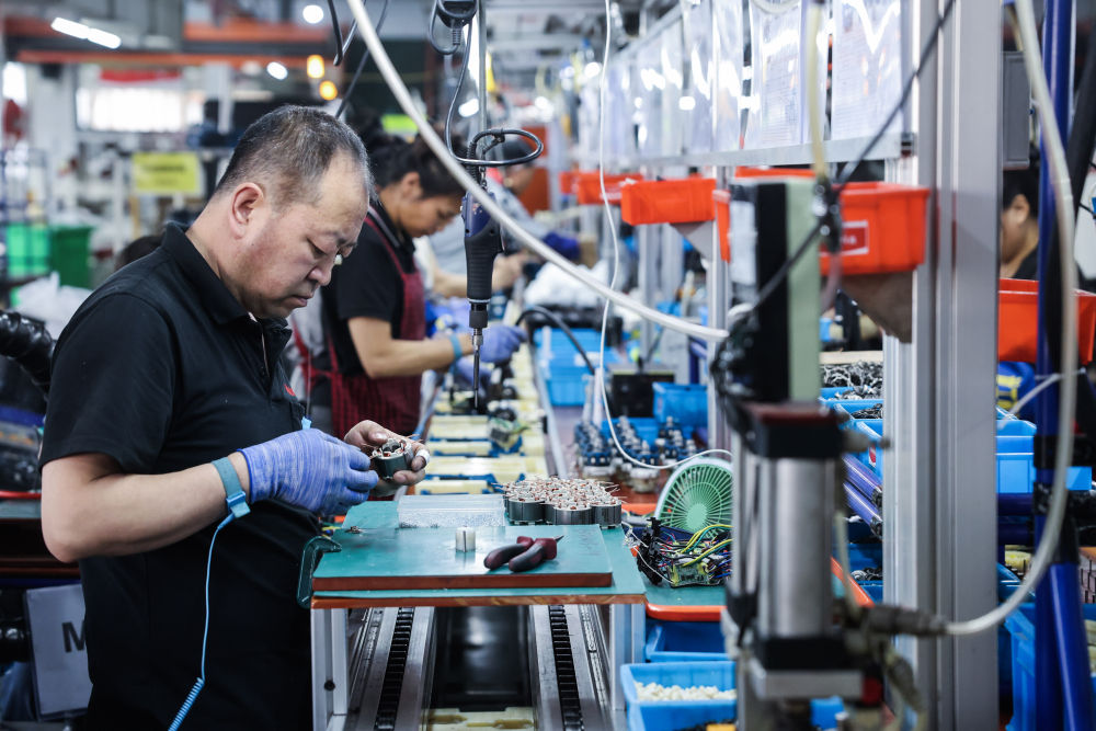 3月26日,在位于嘉興南湖區(qū)余新鎮(zhèn)的浙江亞特電器股份有限公司生產(chǎn)車間,工作人員對(duì)出口的園林工具進(jìn)行組裝。