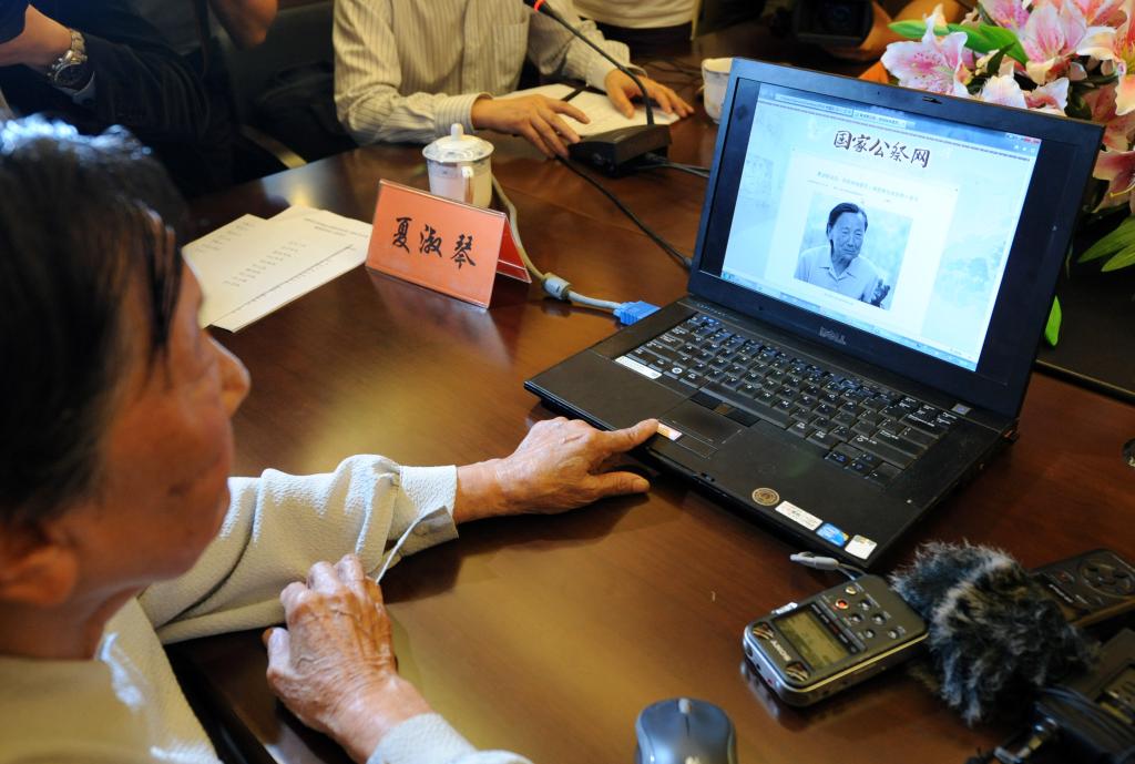 ↑2014年9月17日,夏淑琴點(diǎn)開自己口述證言公布網(wǎng)頁。從當(dāng)日起,侵華日軍南京大屠殺遇難同胞紀(jì)念館連續(xù)100天每天在國家公祭網(wǎng)和紀(jì)念館官方網(wǎng)站上公布一位南京大屠殺幸存者口述證言。新華社記者 孫參 攝