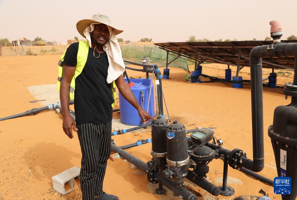 5月22日,在毛里塔尼亞西部特拉扎區(qū)比爾·巴爾卡村,中非綠色技術公園園區(qū)灌溉技術工人穆罕默德·伊塞勒穆介紹園區(qū)智能灌溉設備。新華社記者 司源 攝