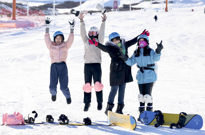 2025年1月27日,幾名滑雪愛(ài)好者在新疆絲綢之路山地度假區(qū)合影留念。新華社記者 王菲 攝