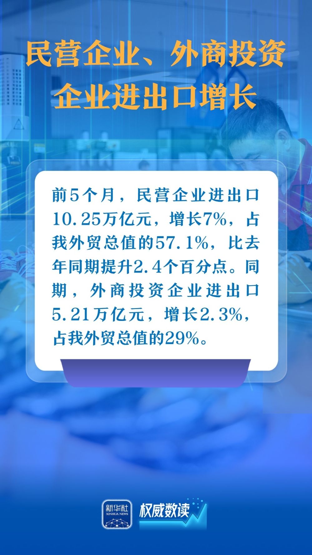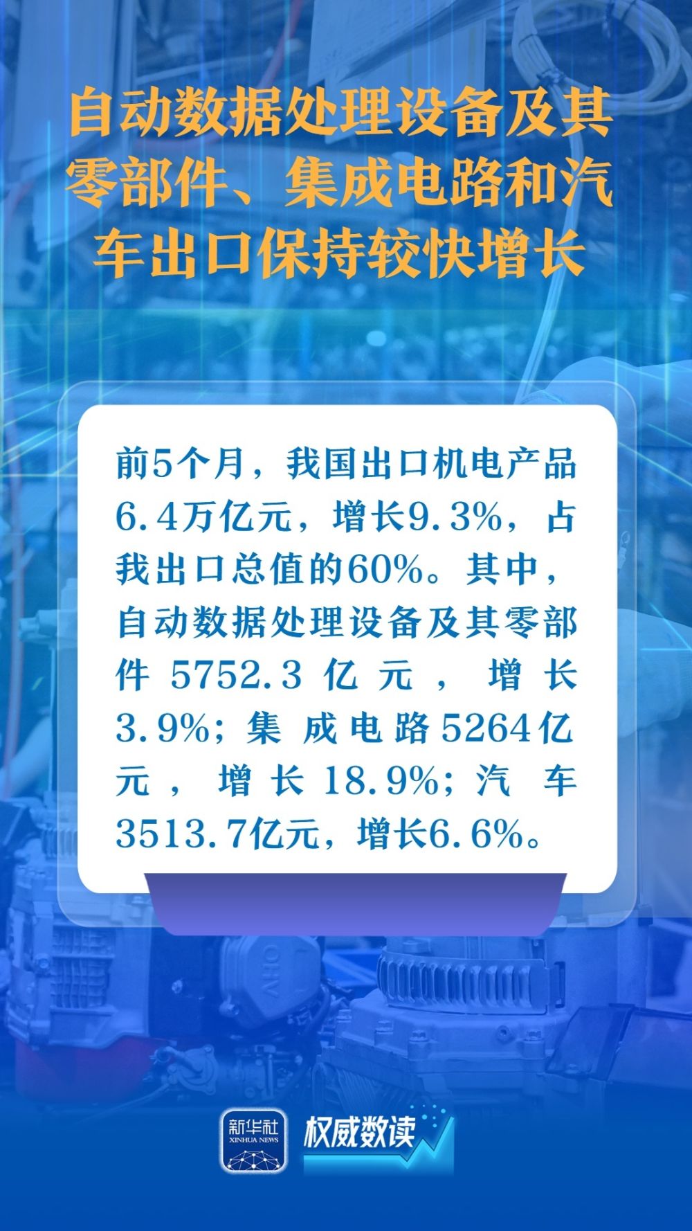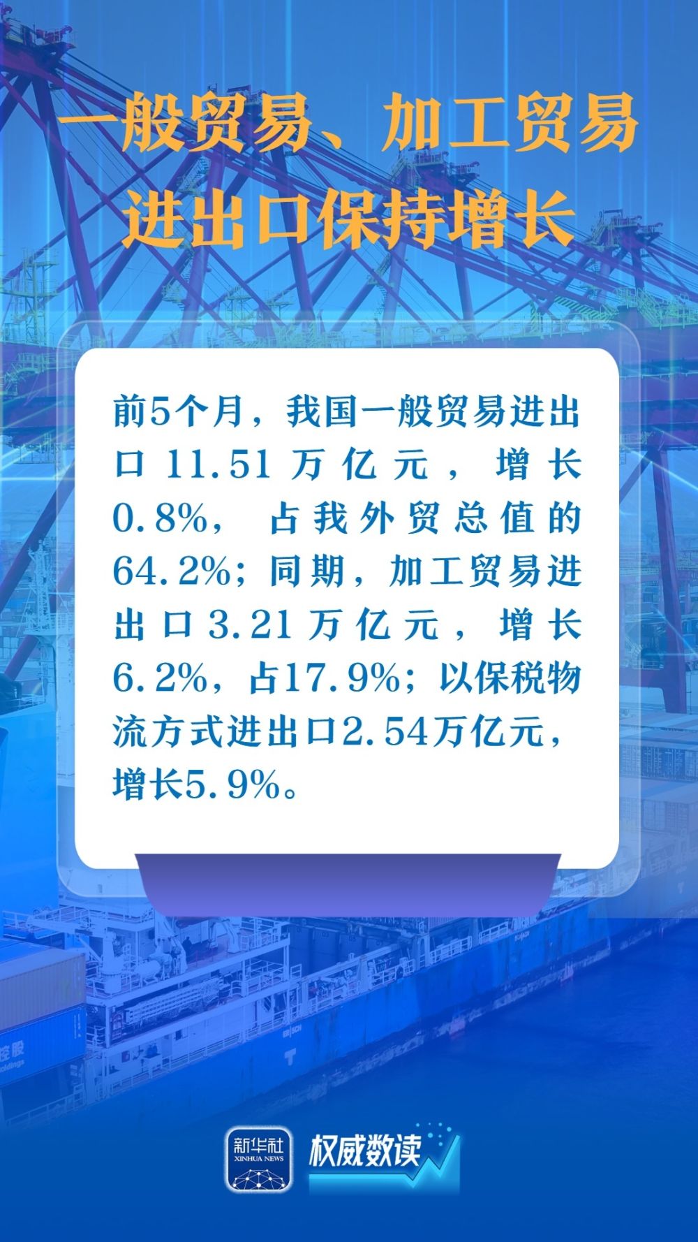 海關總署9日發(fā)布數(shù)據(jù),今年前5個月,我國貨物貿易進出口總值17.94萬億元人民幣,同比增長2.5%。以下幾組數(shù)據(jù),展示出我國對外貿易在外部壓力下依然保持較強韌性。