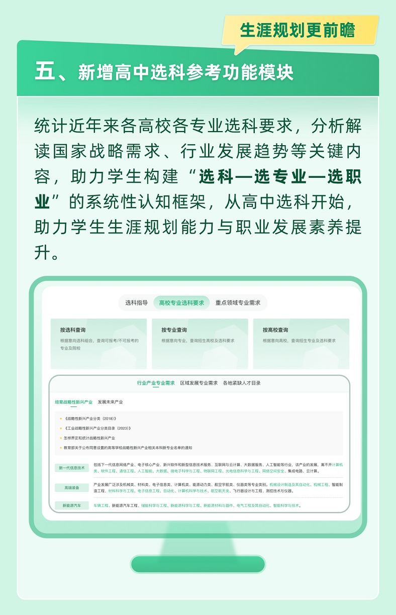 統(tǒng)計(jì)近年來各高校各專業(yè)選科要求,分析解讀國(guó)家戰(zhàn)略需求、行業(yè)發(fā)展趨勢(shì)等關(guān)鍵內(nèi)容,助力學(xué)生構(gòu)建“選科—選專業(yè)—選職業(yè)”的系統(tǒng)性認(rèn)知框架,從高中選科開始,助力學(xué)生生涯規(guī)劃能力與職業(yè)發(fā)展素養(yǎng)提升。