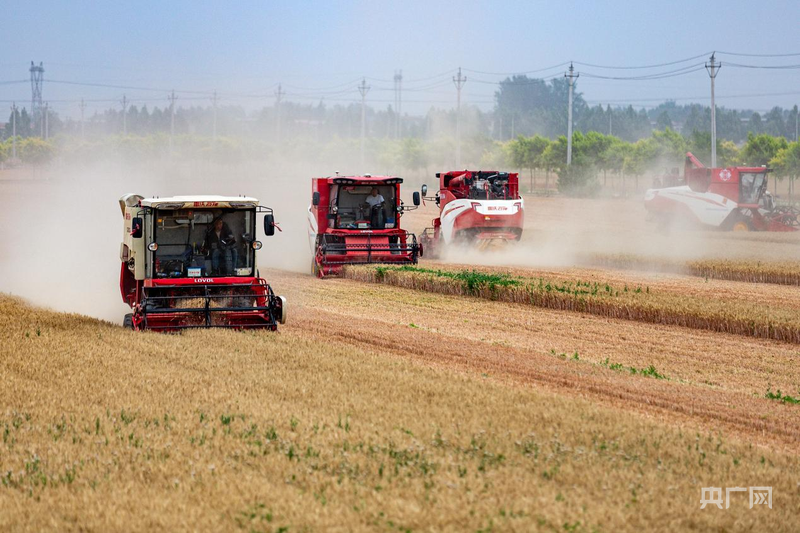 種糧大戶張洪文的4臺聯(lián)合收割機開足馬力馳騁在麥田里(央廣網(wǎng)發(fā) 王建安 攝)