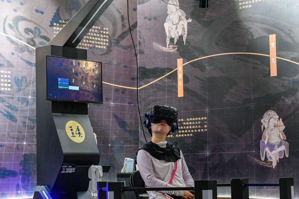2024年7月22日,游客借助VR設備沉浸式游覽莫高窟第285窟虛擬場景。新華社記者 郎兵兵 攝