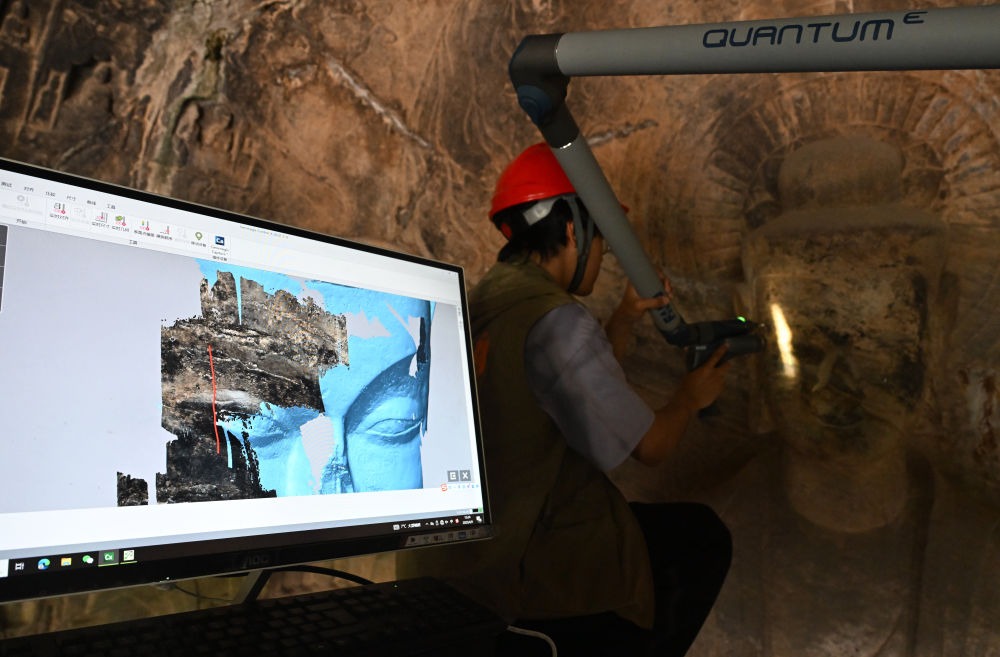 4月9日,武漢大學文化遺產(chǎn)智能計算實驗室團隊成員在龍門石窟魏字洞使用關節(jié)臂掃描儀對佛像進行數(shù)字化掃描。新華社記者 李嘉南 攝