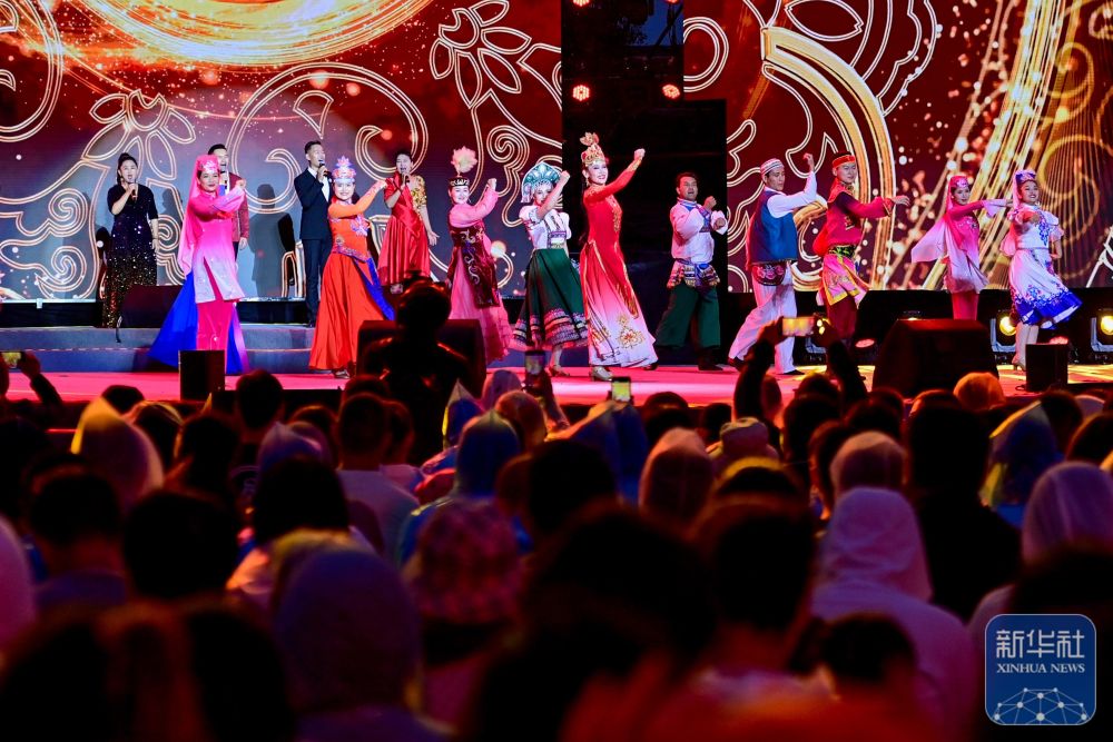 中國文聯(lián)文藝志愿服務(wù)團(tuán)隊(duì)“送歡樂下基層”文藝演出在新疆伊犁哈薩克自治州霍城縣香水體育公園舉行(6月14日攝)。