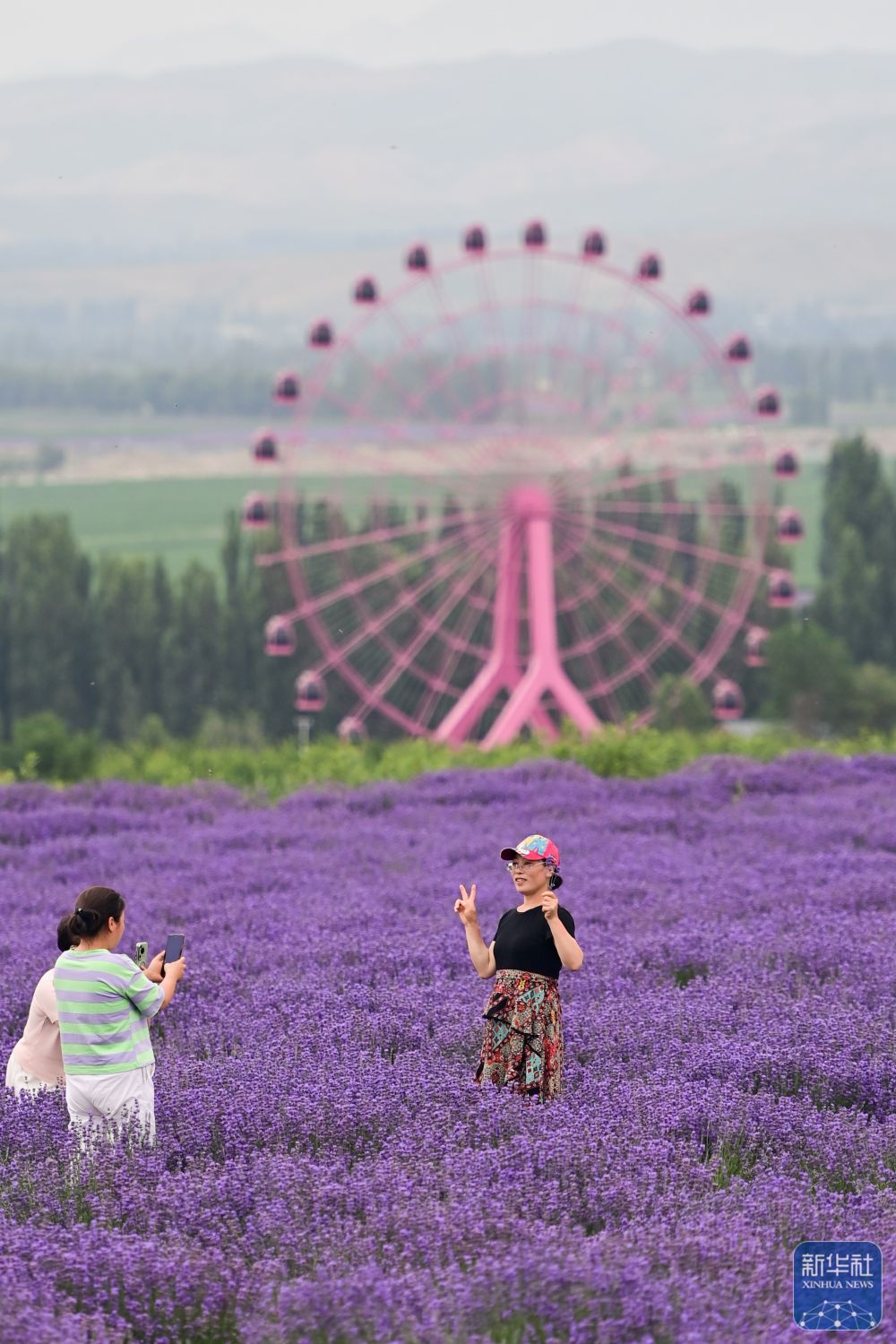在新疆伊犁哈薩克自治州霍城縣解憂公主薰衣草園,游客在非遺集市游覽拍照(6月14日攝)。