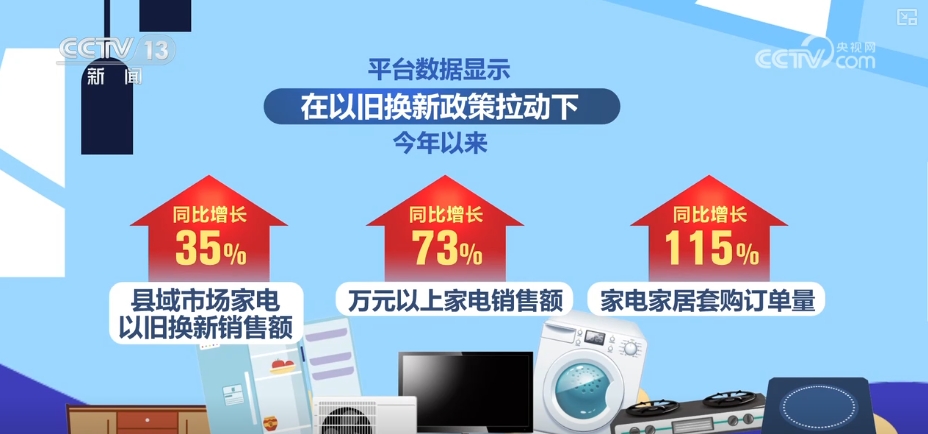 平臺數(shù)據(jù)顯示,在“以舊換新”政策拉動下,2025年以來,縣域市場家電“以舊換新”銷售額同比增長35%,萬元以上家電銷售額同比增長73%,家電家居套購訂單量同比增長115%。