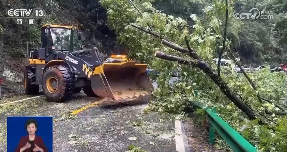 在邊坡垮塌現(xiàn)場(chǎng),大量泥石和樹木橫倒在道路中間,當(dāng)?shù)毓窊岆U(xiǎn)人員迅速對(duì)此處路段實(shí)施交通管制,并利用機(jī)械開展清障工作。