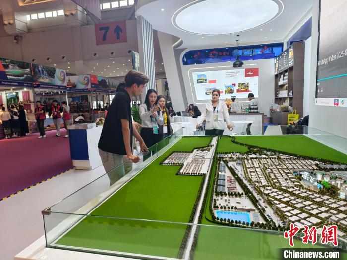 6月20日,第9屆南博會(huì)萬(wàn)象物流園展位工作人員為參觀者介紹園區(qū)情況。 中新社記者 韓帥南 攝