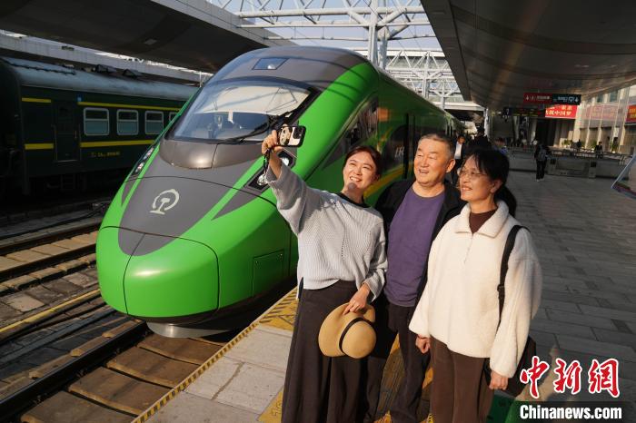 3月28日,中老鐵路第5000萬(wàn)名旅客孫怡薇一家在列車前合影。中新社記者 劉冉陽(yáng) 攝