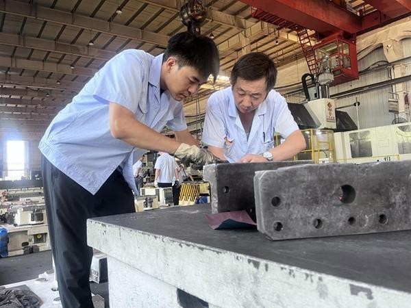 為追趕進度,他主動加碼訓練:夏天的車間猶如“蒸籠”,高強度訓練下,他的衣衫反復被汗水浸透,干后結出層層鹽花。他每天從清晨6點訓練到晚上9點,午間匆匆吃口飯便立刻返回實訓場;深夜,他仍手捧理論書籍逐字鉆研,直到雙眼難睜才休息。在圖紙繪制上,別人畫一遍的圖紙,他至少畫3遍?!跋葢{記憶臨摹,再照著實物校準,用尺子反復丈量線條誤差,必須通過多次練習,形成精準記憶。”黨金鑫說。