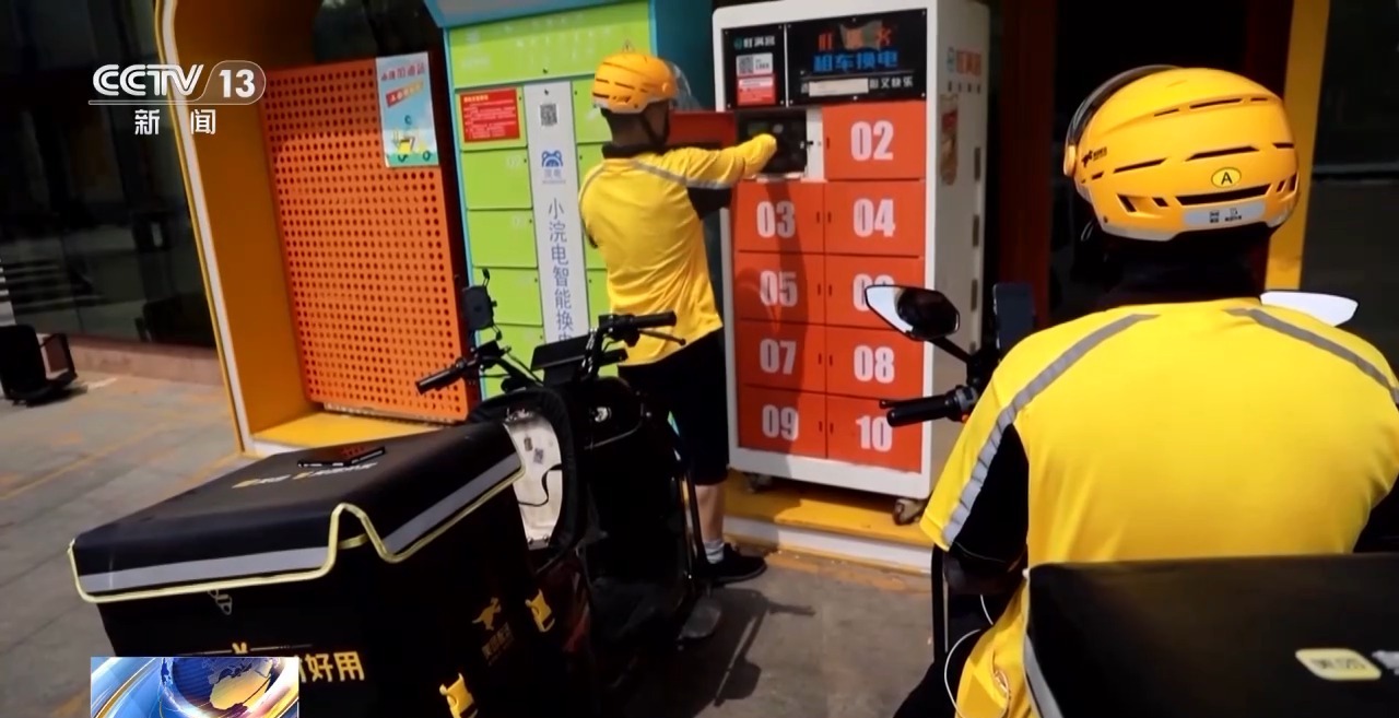外賣員 崔鳳洋:給我們提供了很方便的換電站,我們?nèi)绻叻迤跊]有電了,可以來這里換電,如果中午非常熱,感到身體有點難受可以到這來,也提供解暑藥品。
