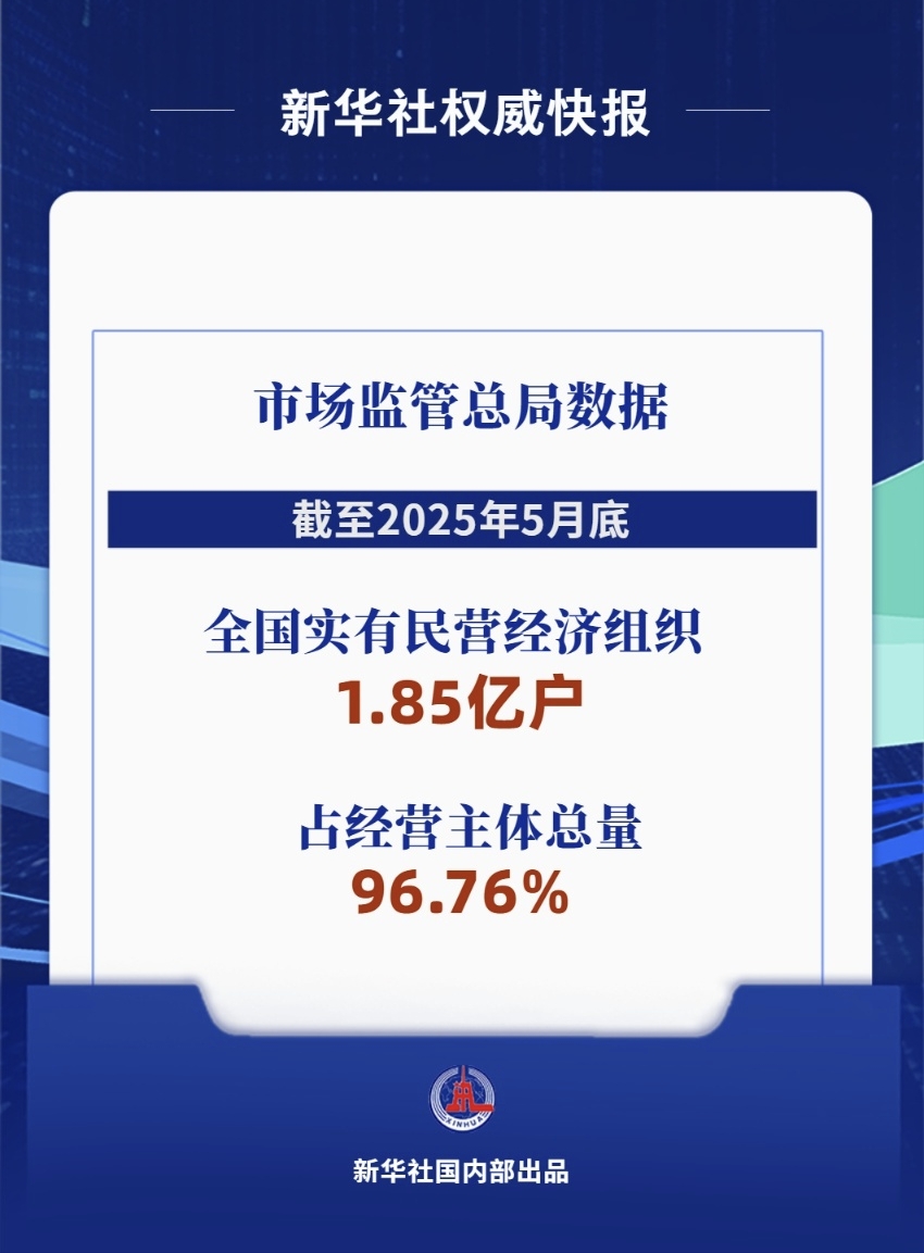 市場監(jiān)管總局?jǐn)?shù)據(jù)顯示,截至2025年5月底,全國實(shí)有民營經(jīng)濟(jì)組織1.85億戶,占經(jīng)營主體總量的96.76%,同比增長2.3%。其中,民營企業(yè)數(shù)量突破5800萬戶,同比增長5.2%;個(gè)體工商戶達(dá)1.27億戶,同比增長1%。