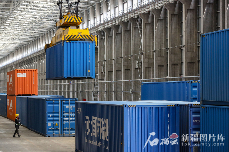 6月24日,阿拉山口站中歐(中亞)班列換裝區(qū)內的行車在吊裝集裝箱。蔡增樂 攝