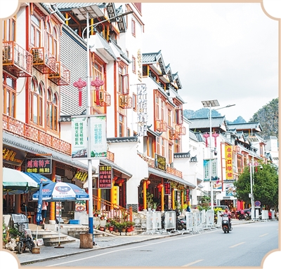 身著“奧黛”的中國(guó)游客在中越友誼街前留影。