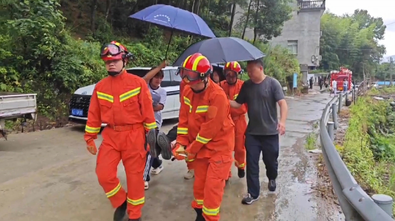 在臺州黃巖嶼頭鄉(xiāng),轉(zhuǎn)移小組在排查中發(fā)現(xiàn)上鳳村一處地質(zhì)災害隱患點居住著一位92歲老人,大家立即取來擔架將老人慢慢抬出。在大家冒雨接力下,老人被護送至安置點。