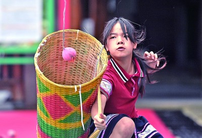 廣西龍勝各族自治縣龍勝鎮(zhèn)第二小學,一名學生在大課間練習接繡球。新華社發(fā)