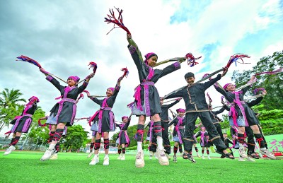 海南五指山市紅星學校學生在練習苗族盤皇舞。新華社發(fā)