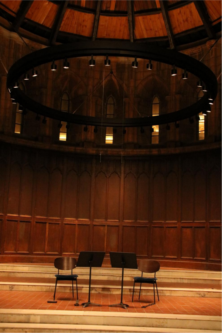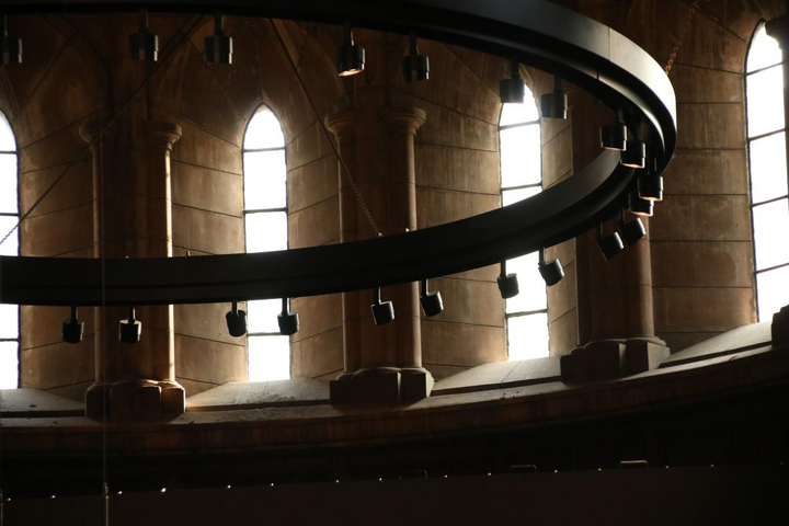 在原來(lái)祭臺(tái)的中間,現(xiàn)在改造為演講、演奏的環(huán)形中心臺(tái)。上方是一個(gè)中央環(huán)形燈,在沒(méi)亮燈之前就像一條烏黑色的緞帶,神秘且漂亮。