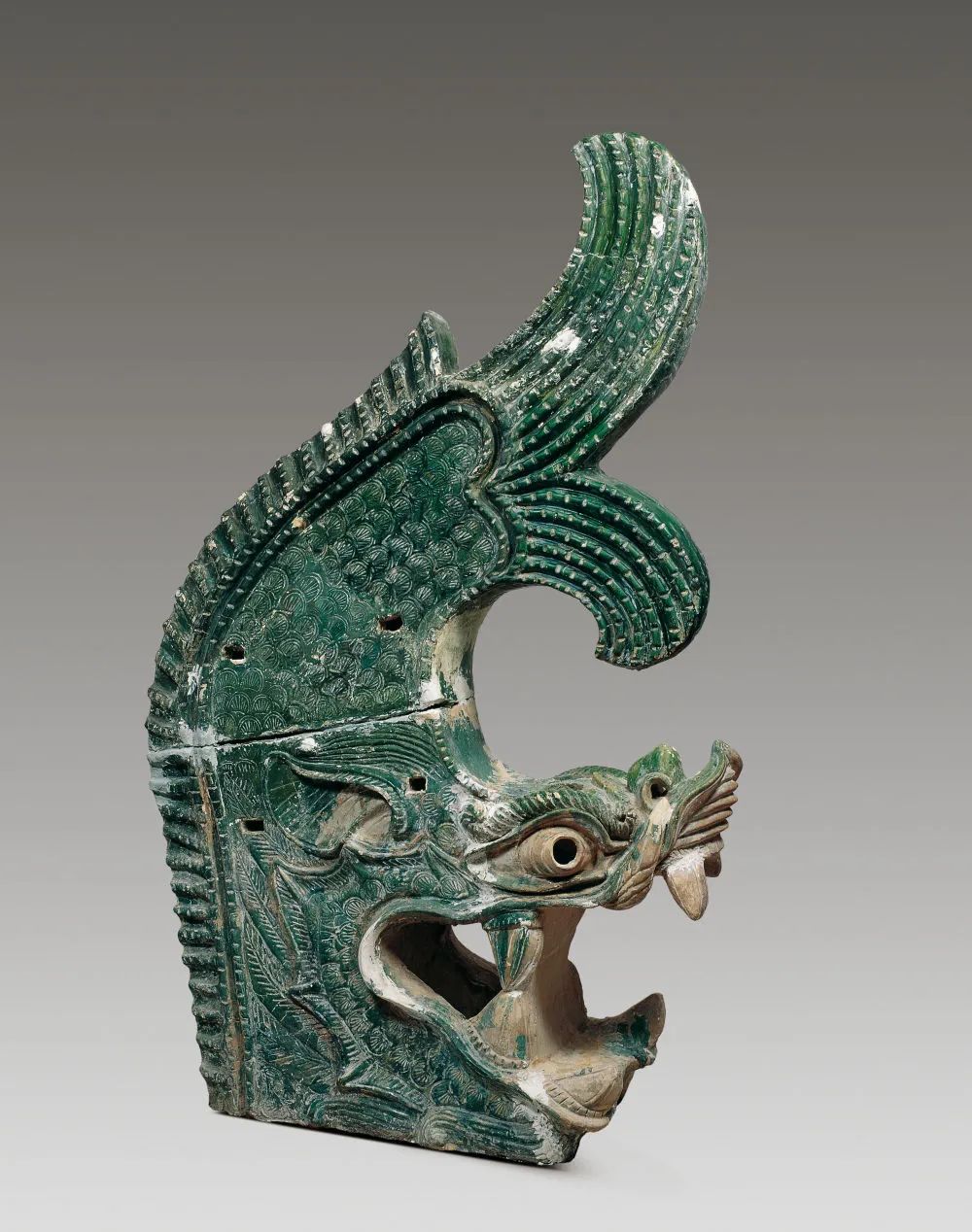 在中國國家博物館“古代中國”基本陳列上,一件出土于西夏陵6號(hào)陵的綠釉鴟吻十分顯眼。作為西夏陵的一個(gè)建筑構(gòu)件,它形體高大,既與同時(shí)期中原地區(qū)的鴟吻相似,又具有龍頭比例更大、魚尾分叉等方面的獨(dú)創(chuàng)性。