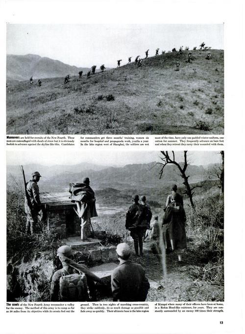 這是1939年7月出版的美國《生活》雜志第13頁影印件,展示了史沫特萊拍攝的新四軍訓(xùn)練和偵察的一些畫面。上圖:新四軍的新兵們開展戰(zhàn)術(shù)訓(xùn)練;下圖:新四軍的偵察小隊正在山谷中執(zhí)行敵情偵察任務(wù)。
