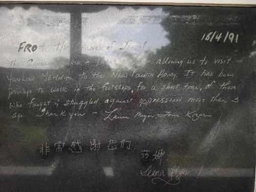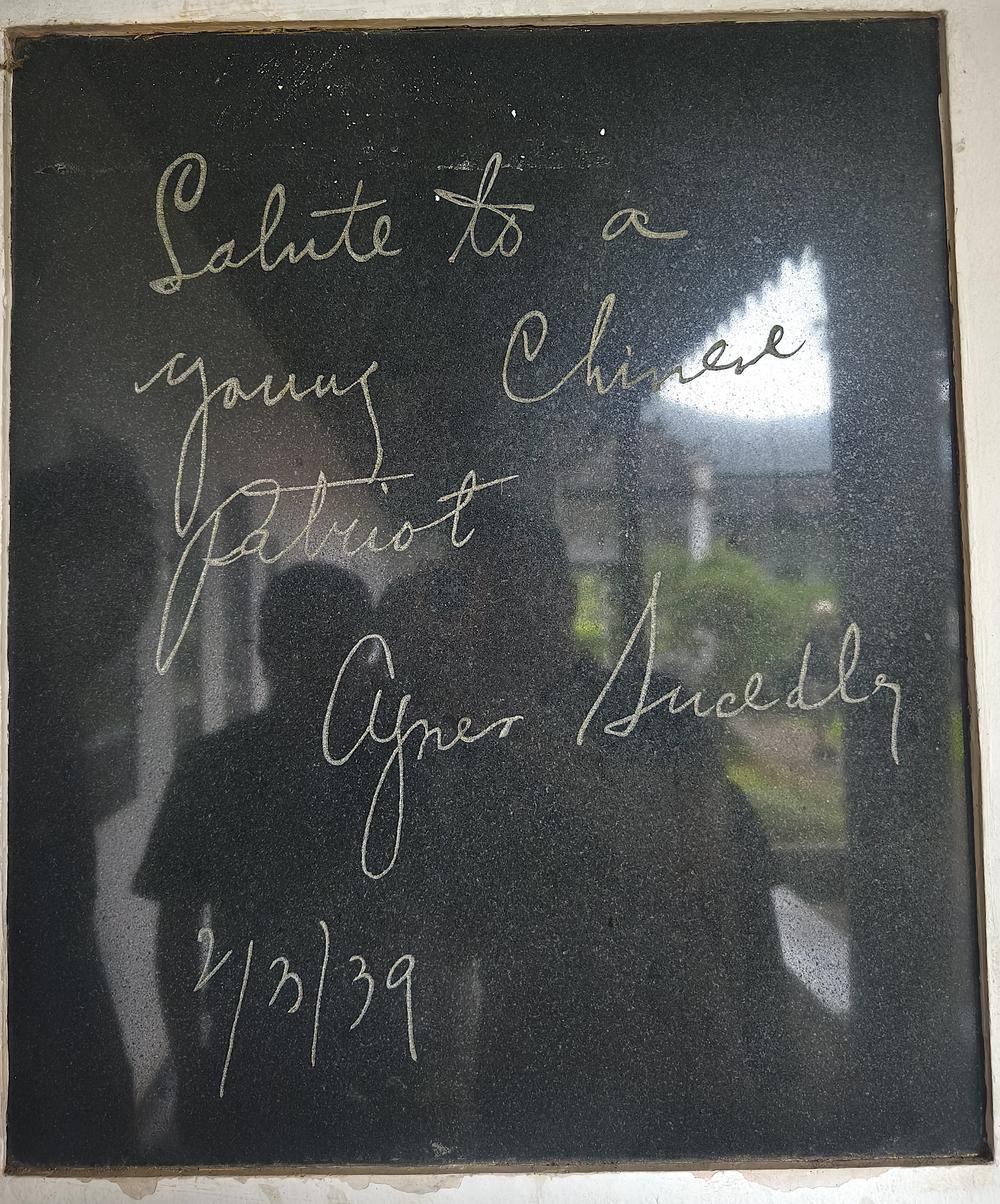 1939年史沫特萊寫給新四軍教導(dǎo)總隊學(xué)員葛涼的一句話語,如今也被鐫刻在石碑之上——“Salute to a young Chinese patriot(向一位年輕的中國愛國者致敬)”。