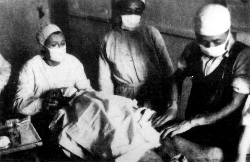1939年,在安徽省宣城市涇縣云嶺鎮(zhèn),新四軍軍醫(yī)處醫(yī)務(wù)主任宮乃泉(右一)與加拿大護士瓊·尤恩(左一)等為戰(zhàn)士做手術(shù),照片由新四軍軍長葉挺拍攝。