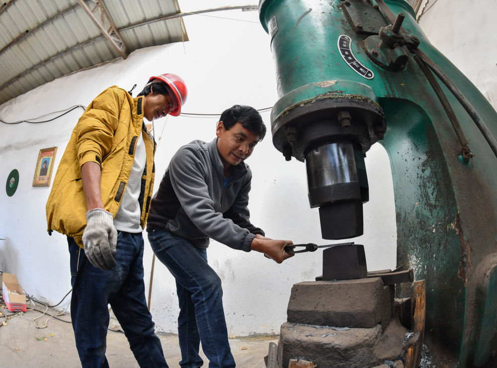 在孜托鎮(zhèn)加日扎村民族手工藝品加工合作社里,寸昆杰向徒弟們示范洛隆藏刀的鍛造工序,他是首位掌握洛隆藏刀技藝的白族人:隨著鼓風機吹動,室內(nèi)一股熱浪撲面而來,被燒得通紅的刀片在空氣錘的敲打下火花四濺……