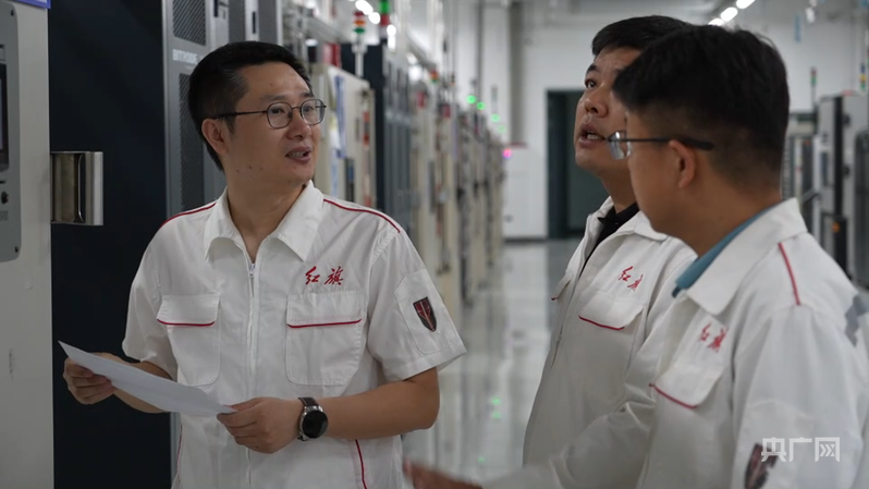 技術(shù)人員討論轉(zhuǎn)子鐵芯安裝(央廣網(wǎng)記者 舒震 攝)