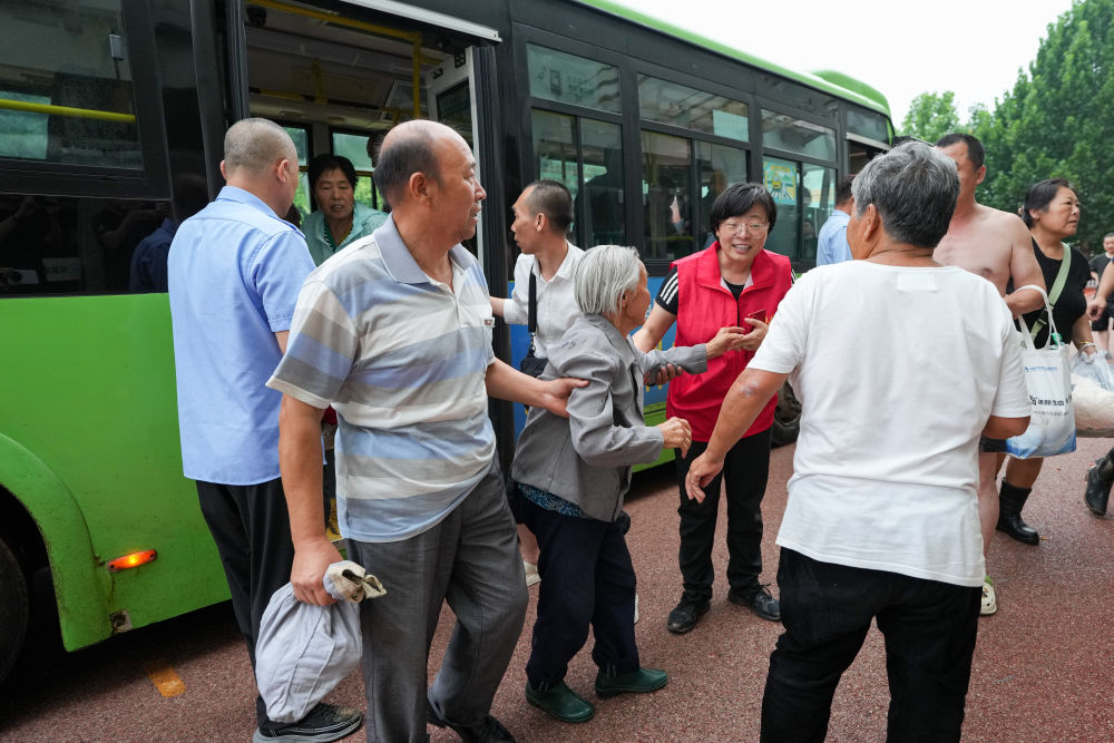7月27日,在北京市密云區(qū)石城鎮(zhèn)中心小學(xué)安置點(diǎn),受災(zāi)群眾乘坐大巴轉(zhuǎn)運(yùn)車抵達(dá)安置點(diǎn)。新華社記者 鞠煥宗 攝
