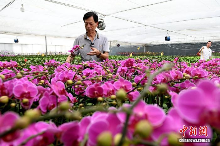 7月16日,臺胞王耀宗在位于福建漳州市南靖縣的天農蘭花園里查看蝴蝶蘭長勢。 中新網記者 呂明 攝