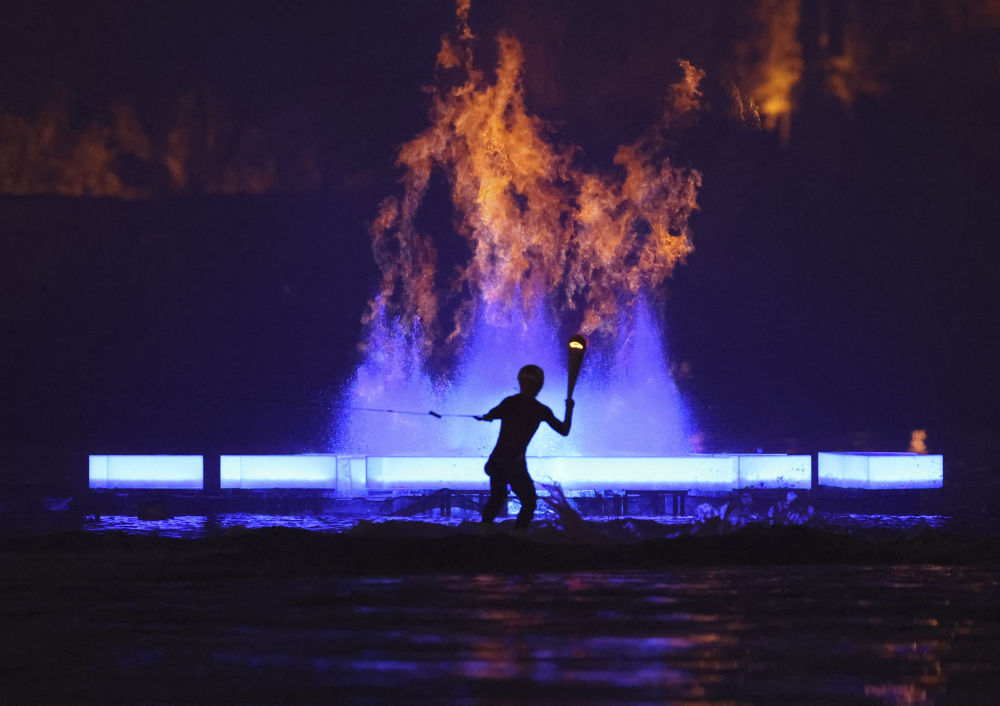 此次開幕式進行了世運會歷史上第一次主火炬點燃儀式,主創(chuàng)團隊經(jīng)過多輪研討,采取火在噴泉中燃燒作為主要創(chuàng)意點,通過精心設計,讓天然氣向上穿過水柱,實現(xiàn)節(jié)能燃燒。