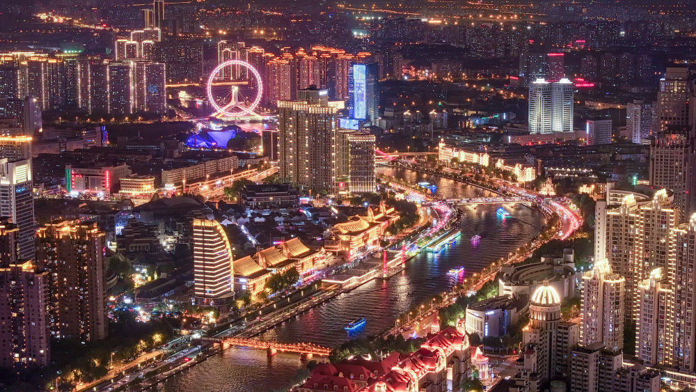 夜幕降臨,海河兩岸璀璨絢麗、千變?nèi)f化:高層建筑披上燈光外衣,勾勒出兩岸高低協(xié)調(diào)、錯落有致的天際線;跨越在海河兩岸的座座橋梁,如長虹臥波、玉帶蜿蜒;游人排隊(duì)乘坐永樂橋“天津之眼”摩天輪,座艙升至最高處,可將大半座城市的繁華盡收眼底……