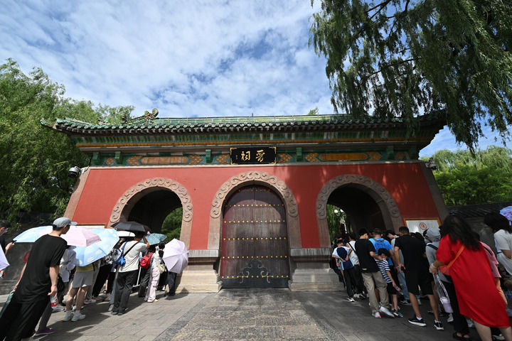 2025年8月7日,游客在晉祠難老泉排隊(duì)觀泉。新華社記者 詹彥 攝