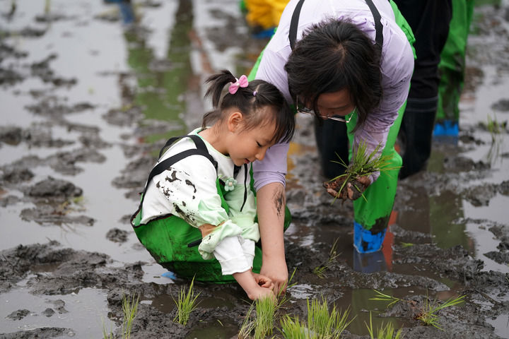 2024年5月4日,在太原市晉源區(qū)晉祠鎮(zhèn)北大寺村的稻田里,小朋友和家長在體驗(yàn)插秧。新華社記者 詹彥 攝