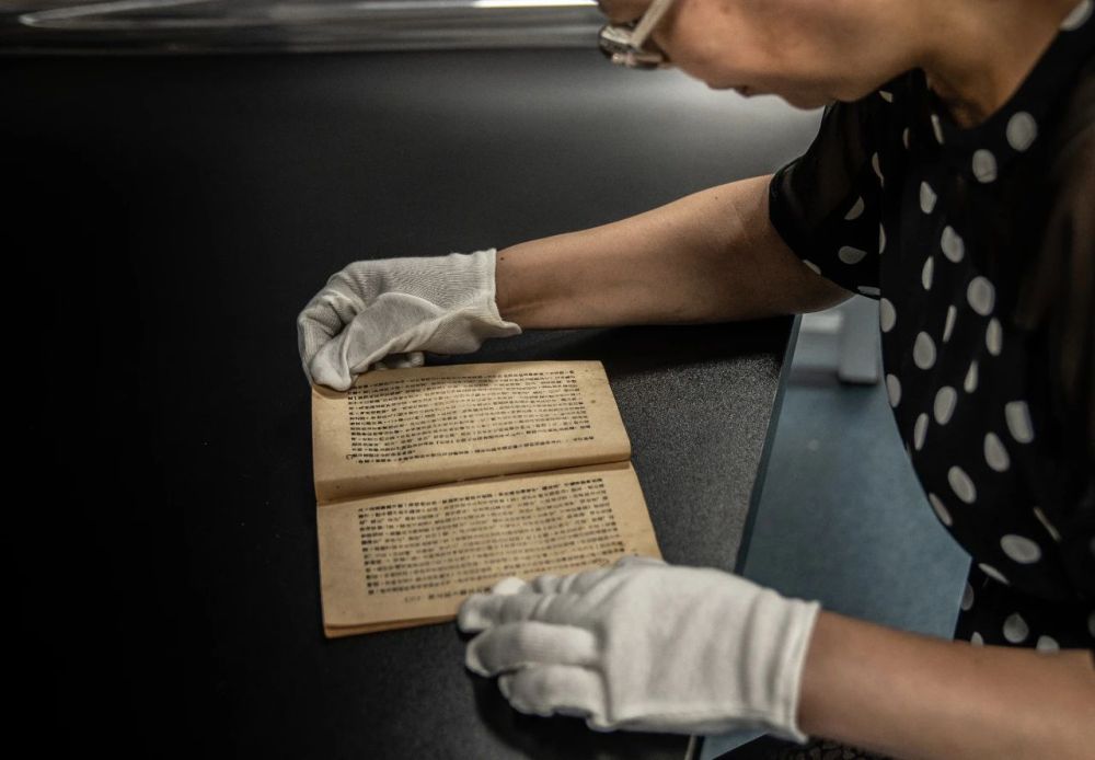 8月4日,遼沈戰(zhàn)役紀念館工作人員展示館內收藏的穆青同志采寫的《東北抗日聯(lián)軍斗爭史略》。(遼沈戰(zhàn)役紀念館供圖)