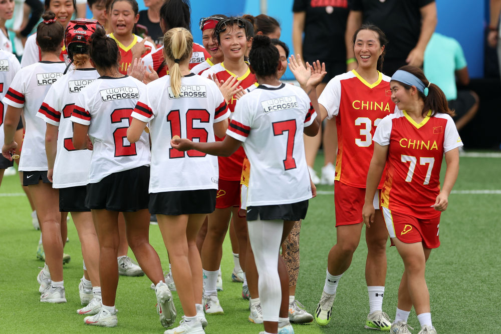 8月9日,中國棍網(wǎng)球隊(duì)球員與加拿大隊(duì)球員賽后擊掌致意。新華社記者 陳斌 攝