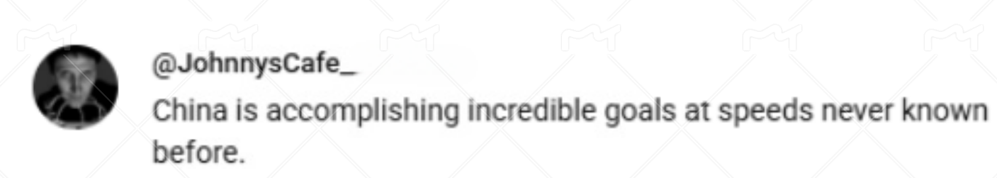 網(wǎng)友@JohnnysCafe_表示,“中國正在以前所未有的速度實(shí)現(xiàn)令人難以置信的目標(biāo)。”