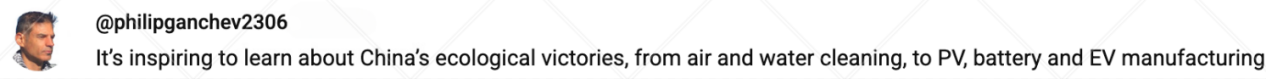 網(wǎng)友@philipganchev2306表示,“從空氣和水凈化到光伏、電池和電動(dòng)汽車制造,了解中國在生態(tài)領(lǐng)域取得的成就令人鼓舞。”