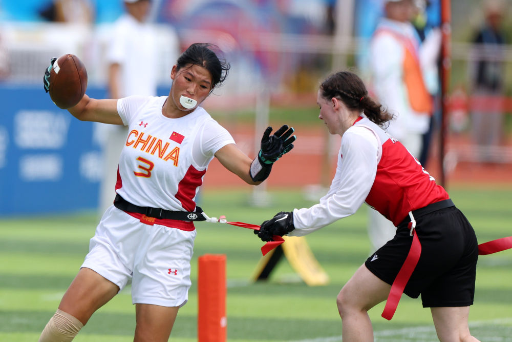 8月14日,在2025年成都世運(yùn)會(huì)腰旗橄欖球女子預(yù)賽A組比賽中,中國(guó)隊(duì)45:47不敵奧地利隊(duì)。圖為中國(guó)隊(duì)球員高子旋(左)在比賽中。新華社記者 陳斌 攝